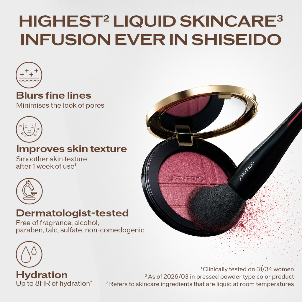 Infused with Shiseido's highest ever percentage of liquid skincare ingredients, the innovative skin-loving color powder hydrates and refines bare skin's texture over time.